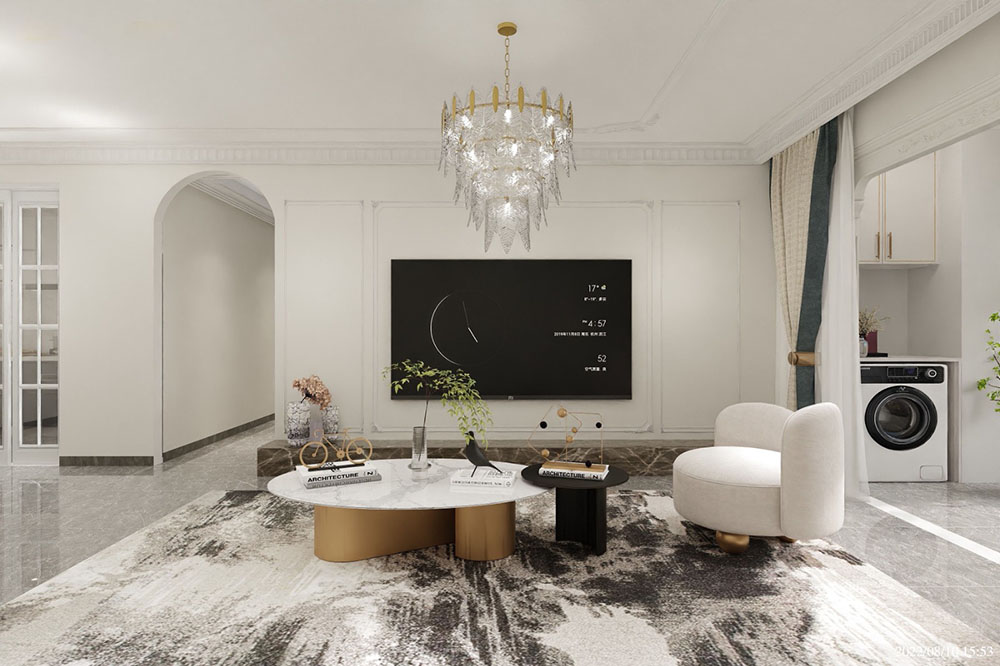 客厅整体的顶面采用石膏线雕花和帖雕花的展示方式,展现出法式优雅的风格。石膏线雕花被巧妙地应用在电视背景墙和拱形门洞的空间中,突出了法式浪漫的特色。客厅的木饰面与石膏线相结合,营造出沙发背景墙的效果。主卧的岩板木饰面背景墙使卧室空间更加丰富多彩,避免了单调的感觉。次卧的石膏线雕花背景墙营造出浓厚的法式氛围。厨房的造型门板和撞色设计使整个空间更加丰富多样且更明亮。北向卧室被设计成书房办公区,提供更加惬意的环境供读书和喝茶。餐边柜两侧采用对称的玻璃门造型,中间的镂空区域更加方便实用。利用玻璃屏风将客厅和餐厅区域分隔开来。衣帽间整面墙定制的设计不仅具备梳妆台和衣柜的收纳功能,还能展示物品。