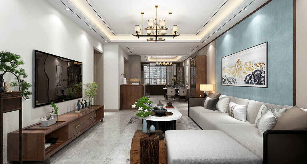 海棠印月131㎡三室一厅客厅新中式轻奢风格装修案例效果图