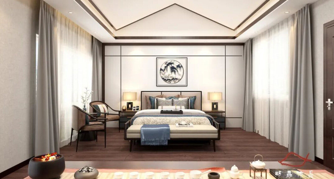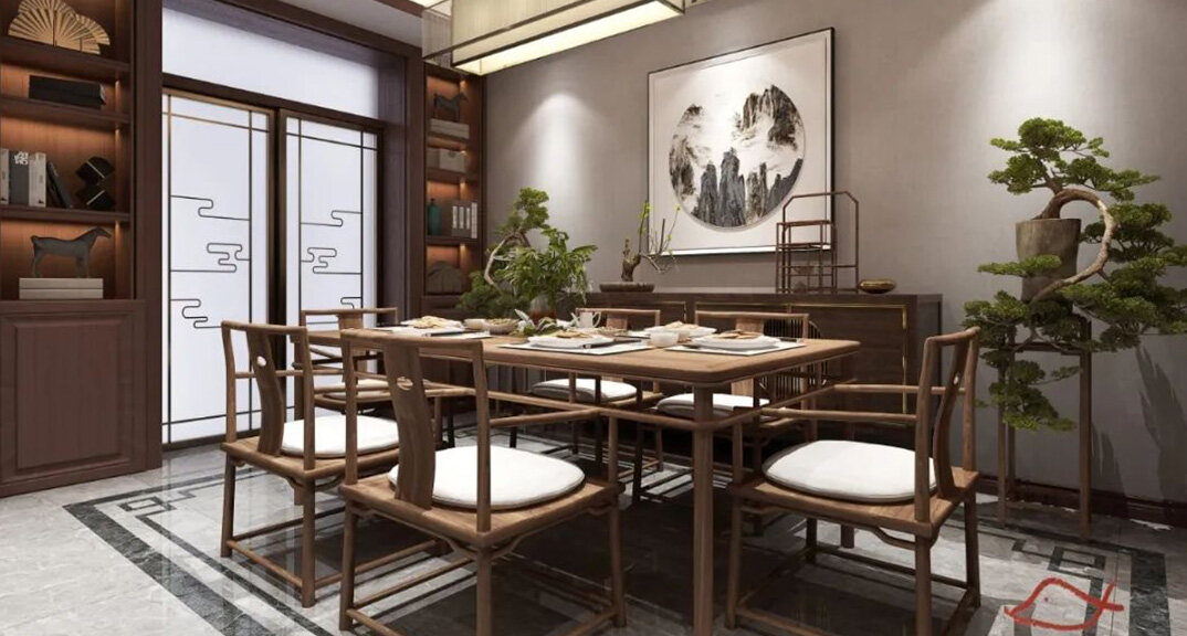 本案将文人雅士之闲情寄于生活中,以新中式的包容开阔之态接纳万物,选取乌金木材质的家具,隐去传统雕龙画凤,汇合现代手法,融诗语画情于一体,彰显东方的大气之姿。乌金木色贯彻整个空间,以自然的深沉色彩堆砌一道壁垒,隔绝了尘世的喧嚣,造就隐士一般“采菊东篱下,悠然见南山”的豁达旷意之境。