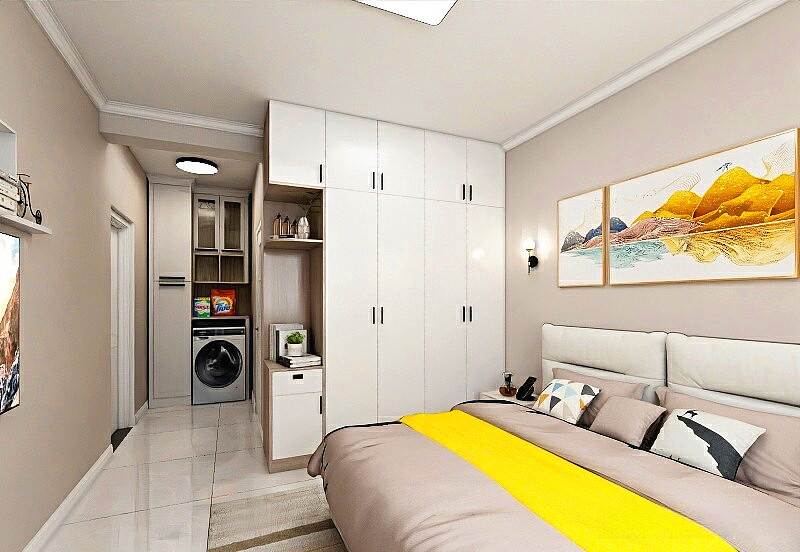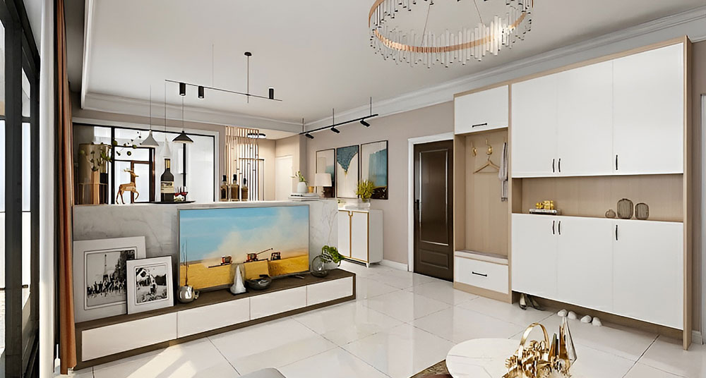 本案整体以现代中式风格为主,既有现代风格简约、明朗的线条,又有中国传统内涵与韵味。墙面大面积使用暖色烘托整体氛围,融洽中式与现代简约两种风格。空间更宽阔舒适玄关收纳、玄关与干区相结合,既解放的外卫的空间客厅电视背景是一面装饰柜,丰富了空间,增加了收纳和储物,美观又实用。