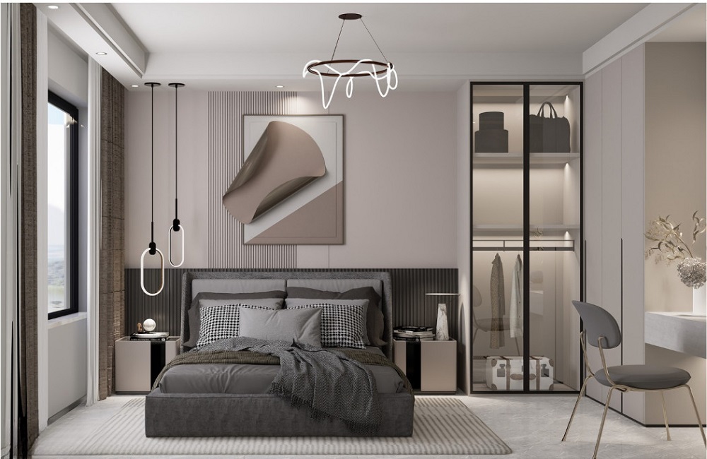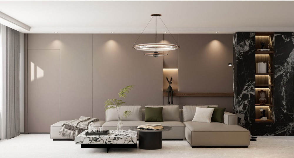 该居室的整体设计采用中性色调,彰显稳重庄重的氛围,散发出品位高雅的感觉。更为重要的是,强调了功能性设计,线条简约流畅,色彩对比明显,让人眼前一亮。